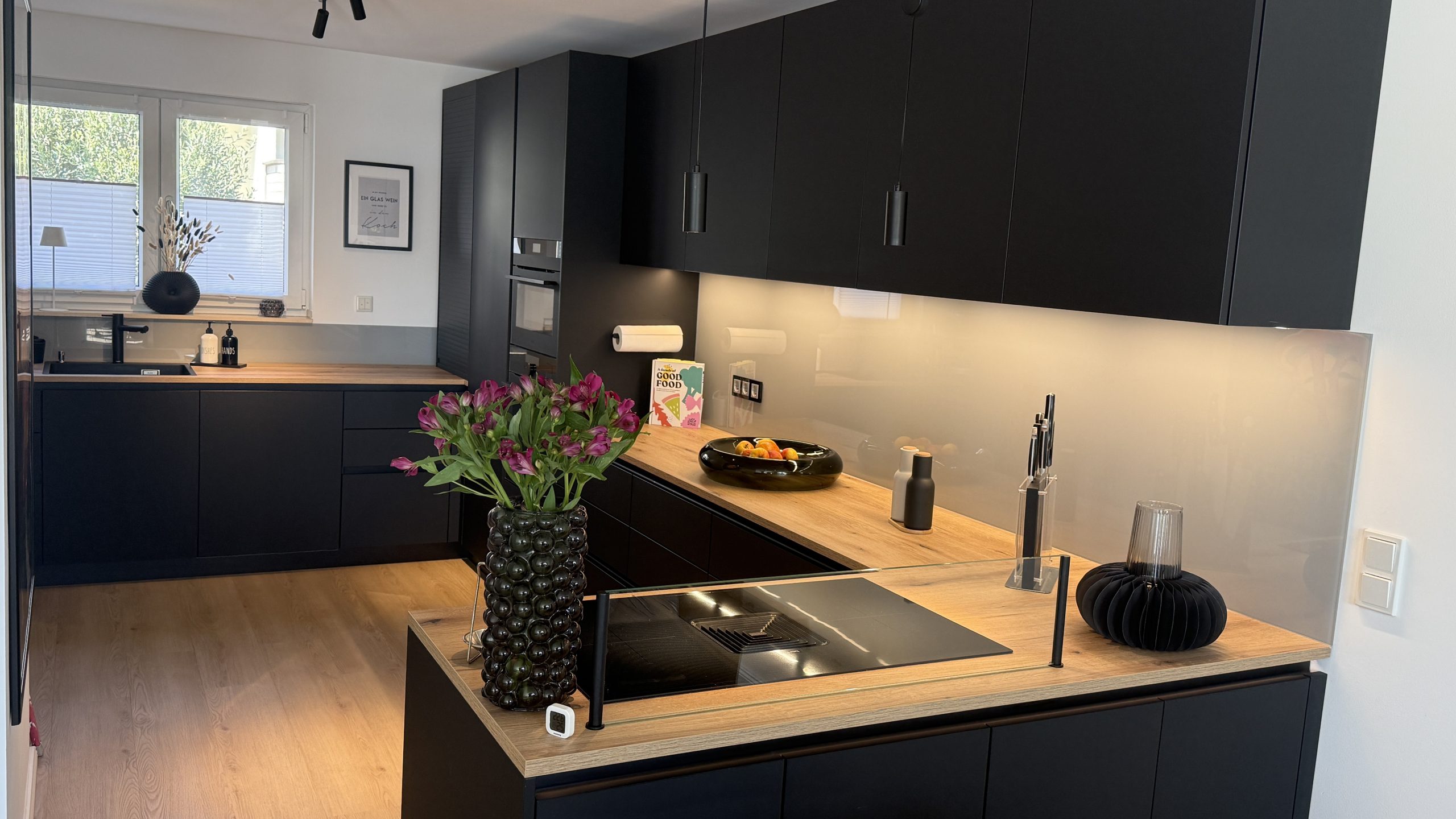 Diese Küche zeigt, wie stark eine reduzierte Gestaltung wirken kann, wenn Material und Farbe präzise aufeinander abgestimmt sind. Mattschwarze Fronten, warme Holzoptik und helle Glasflächen ergeben ein Gesamtbild, das modern, wohnlich und ausdrucksstark zugleich ist.