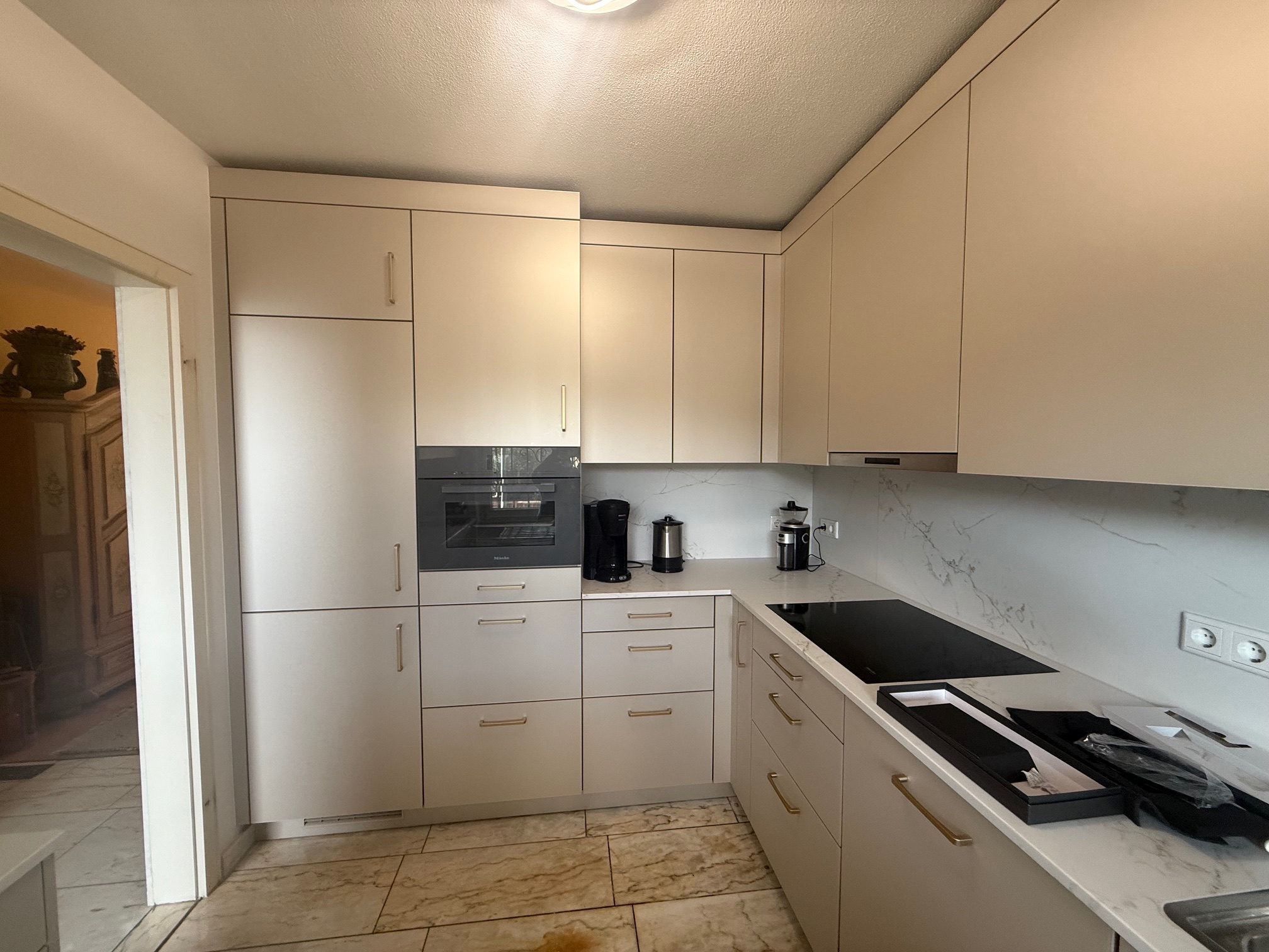 Die Möblierung stammt von Ballerina (Serie XL, Programm SMART-M). Die Front 4686 SMARTGLAS satiniert „Silk Metallic“ sorgt mit ihrer matten Glasoptik für eine edle, reflexionsarme Anmutung. Passend dazu: Wangen und Sockel ebenfalls in SMARTGLAS Silk Metallic sowie Korpusseiten in Light Pepper. Für ruhige Linien sorgen grifflos ausgeführte Bereiche mit Kehlleiste L576 Gold Metallic; wo Griffe sinnvoll sind, kommen G092 in Messing zum Einsatz.