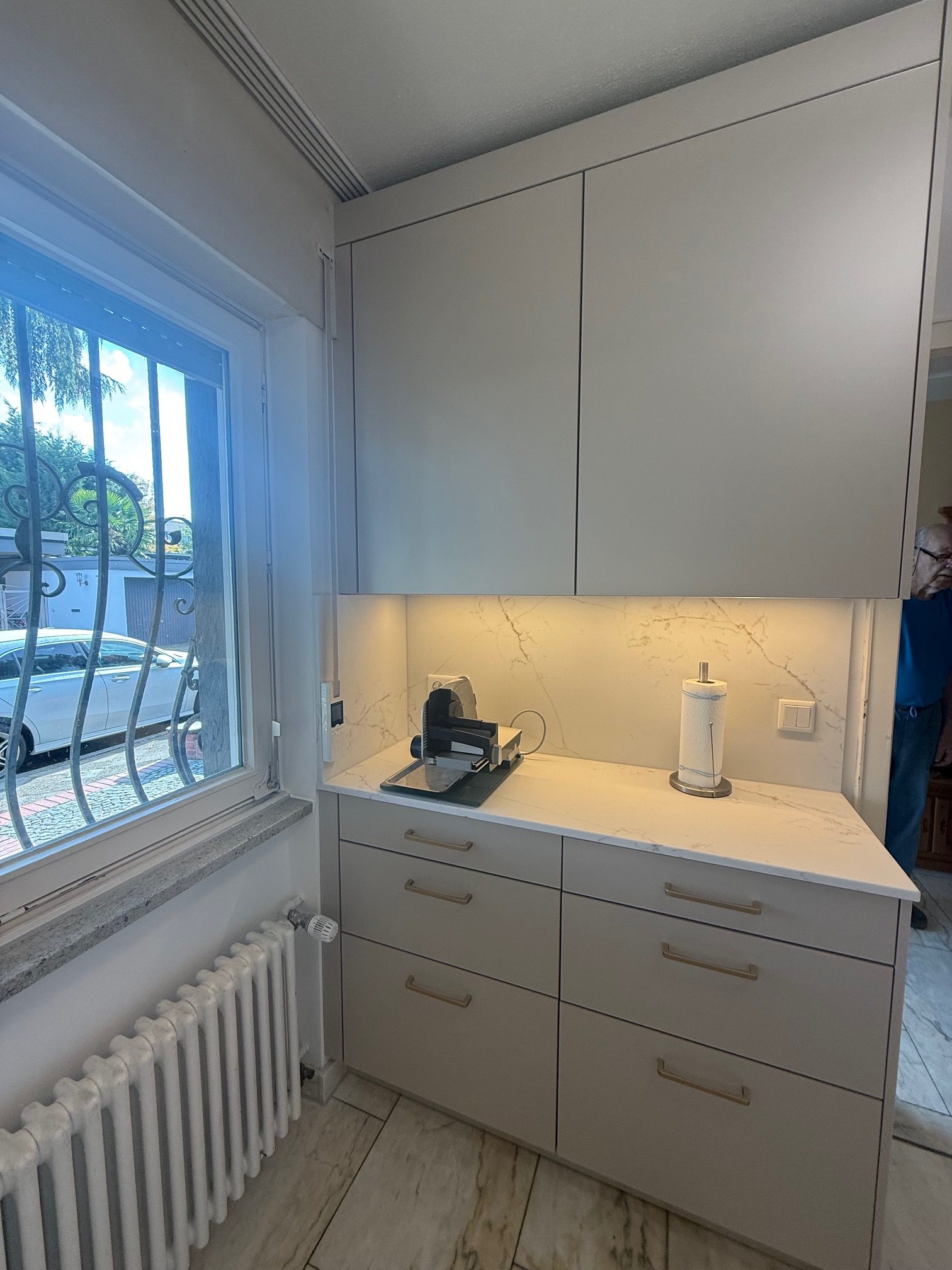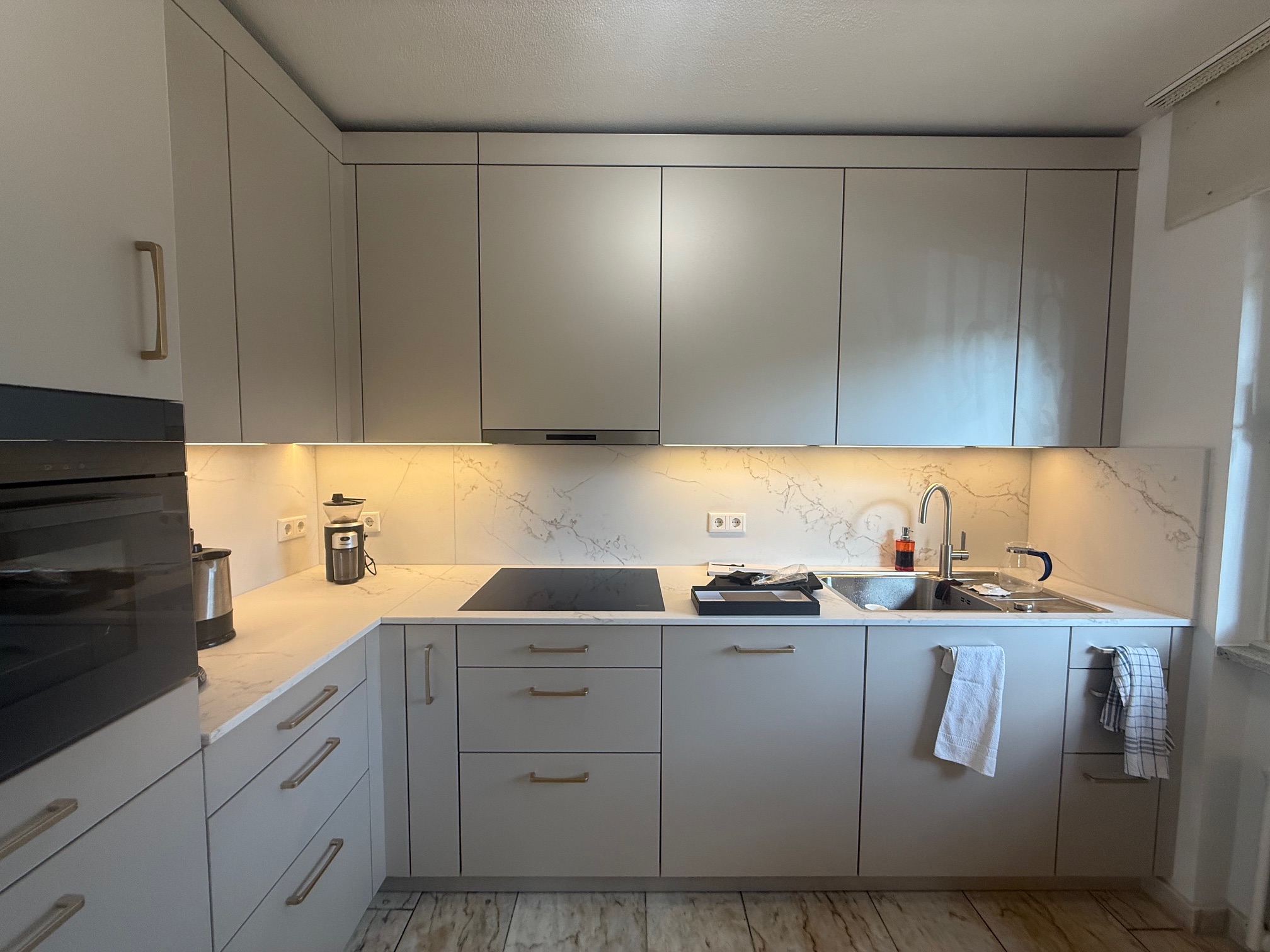Arbeitsplatte und Wandabschluss bestehen aus Quarzkomposit 20 mm in zwei perfekt abgestimmten Finishes: „Golden Swan leather“ auf der Fläche (samtige Haptik, besonders unempfindlich) und „Golden Swan poliert“ als Nischenrückwand (lichtreflektierend, leicht zu reinigen). Der warme Grundton verbindet sich elegant mit Silk Metallic und Messing.